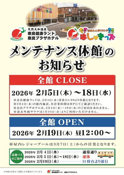 奈良健康ランド及び奈良プラザホテル、奈良わんぱくランドはしゃきっズは下記の日程でメンテナンス休館を行います。