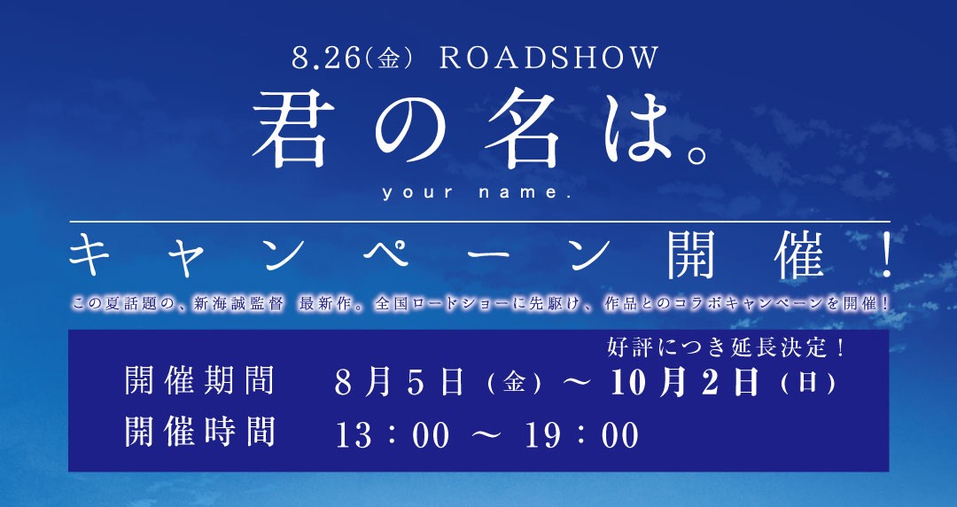10月2日(日)まで、絶賛公開中の映画「君の名は。」の世界観をお楽しみ頂けます。