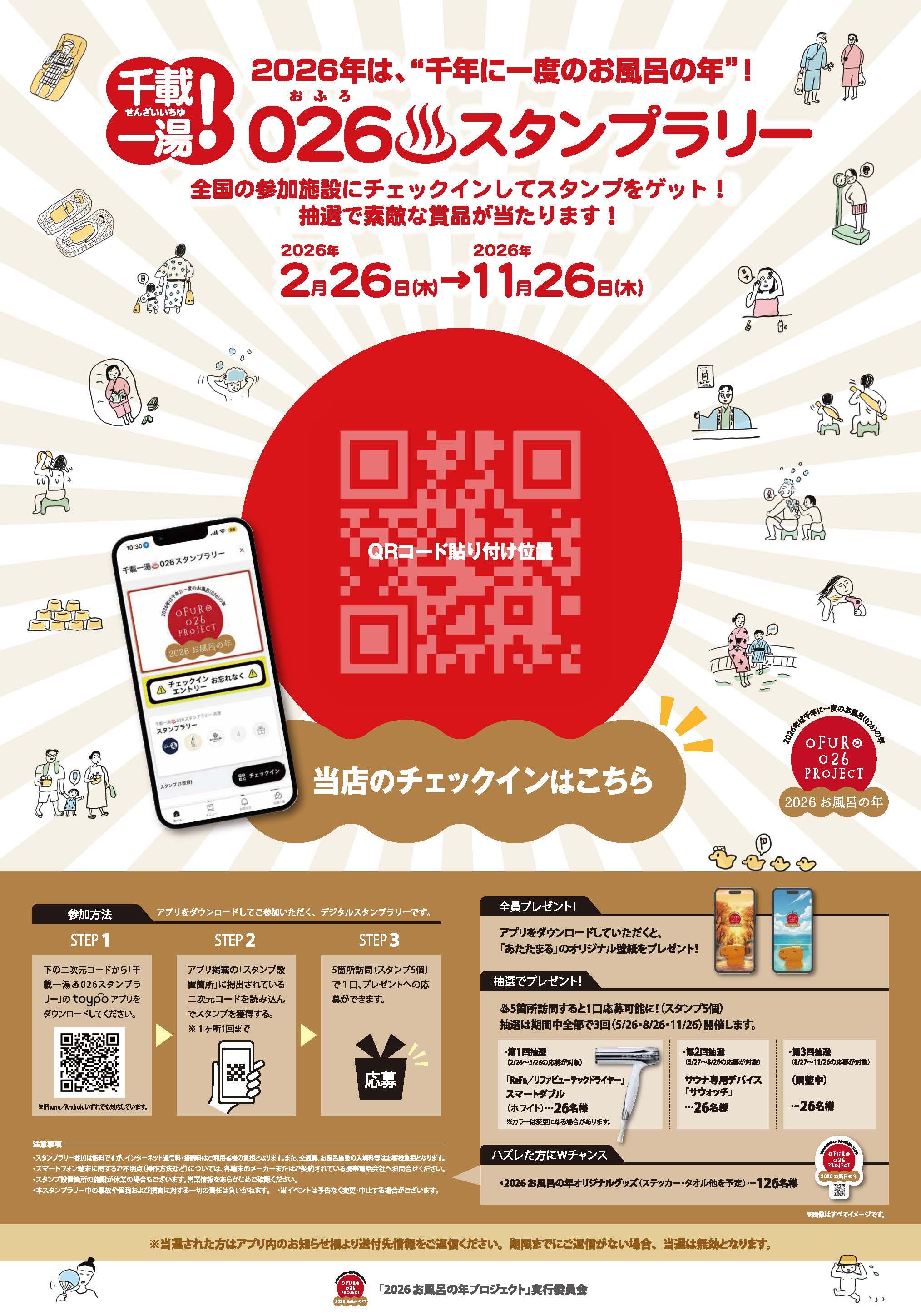 2026年、千年に⼀度のお⾵呂(026)の年を記念して、⽇本全国のお⾵呂をめぐってスタンプを集める「千載⼀湯(せんざいいちゆ)!026♨スタンプラリー」をデジタルプラットフォーム toypo を活⽤して開催いたします!