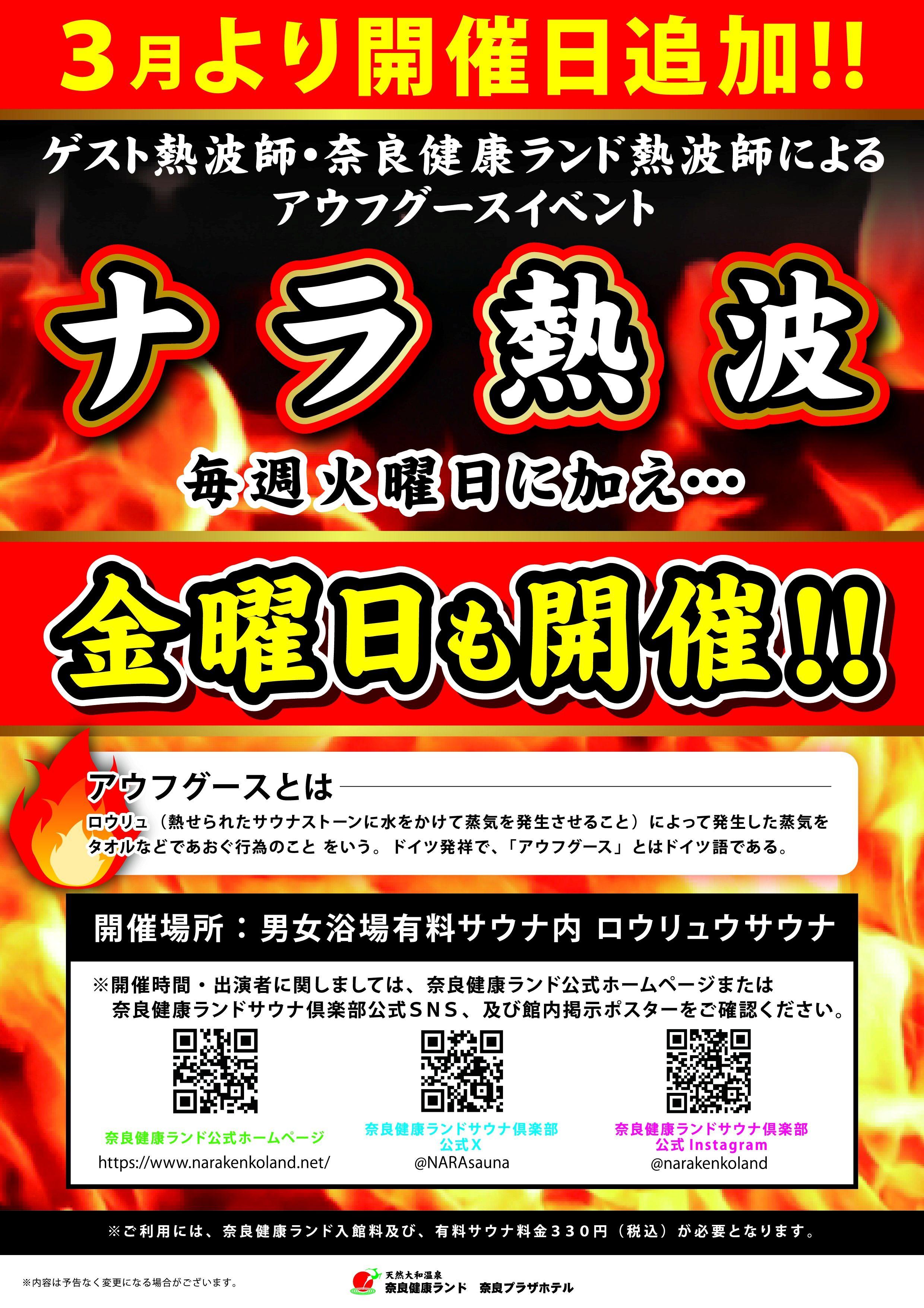 毎週火曜日に有料エリア内で開催していたナラ熱波ですが、2026年3月より金曜日の追加が決定いたしました!!