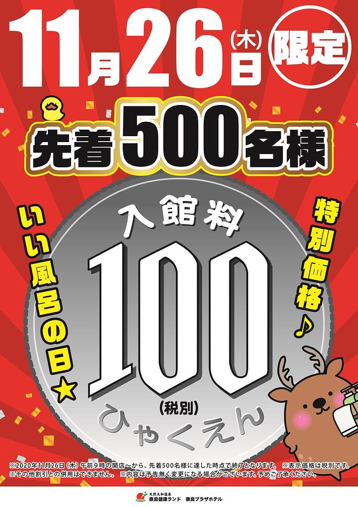 当日先着500名様は、奈良健康ランド入館料が100円(税別)に!?