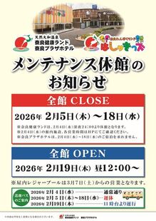 - 奈良健康ランド及び奈良プラザホテル、奈良わんぱくランドはしゃきっズは下記の日程でメンテナンス休館を行います。