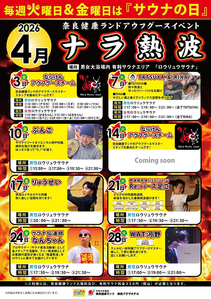 - 参加無料(奈良健康ランド入館料及び有料サウナエリア利用料が必要)