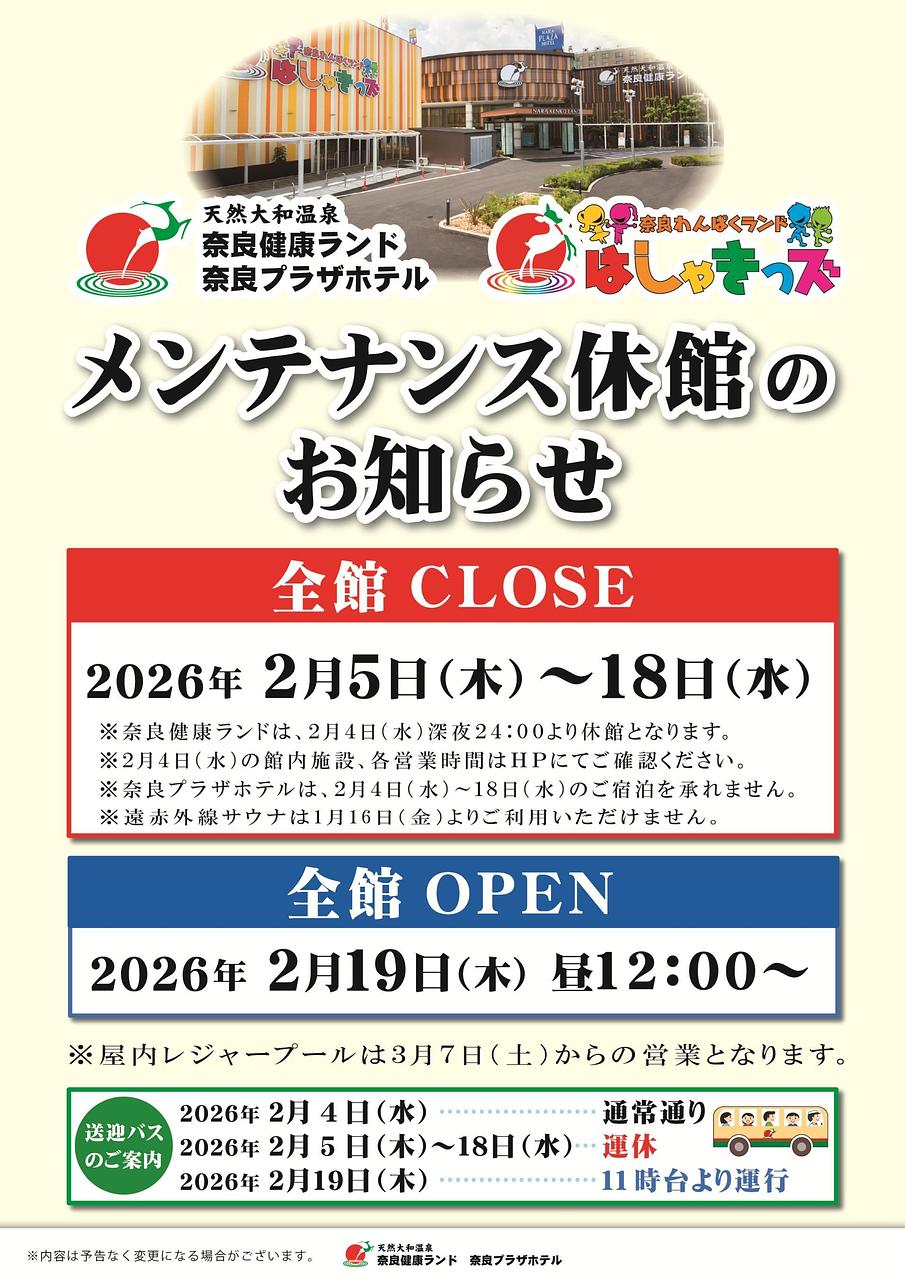 奈良健康ランド及び奈良プラザホテル、奈良わんぱくランドはしゃきっズは下記の日程でメンテナンス休館を行います。
