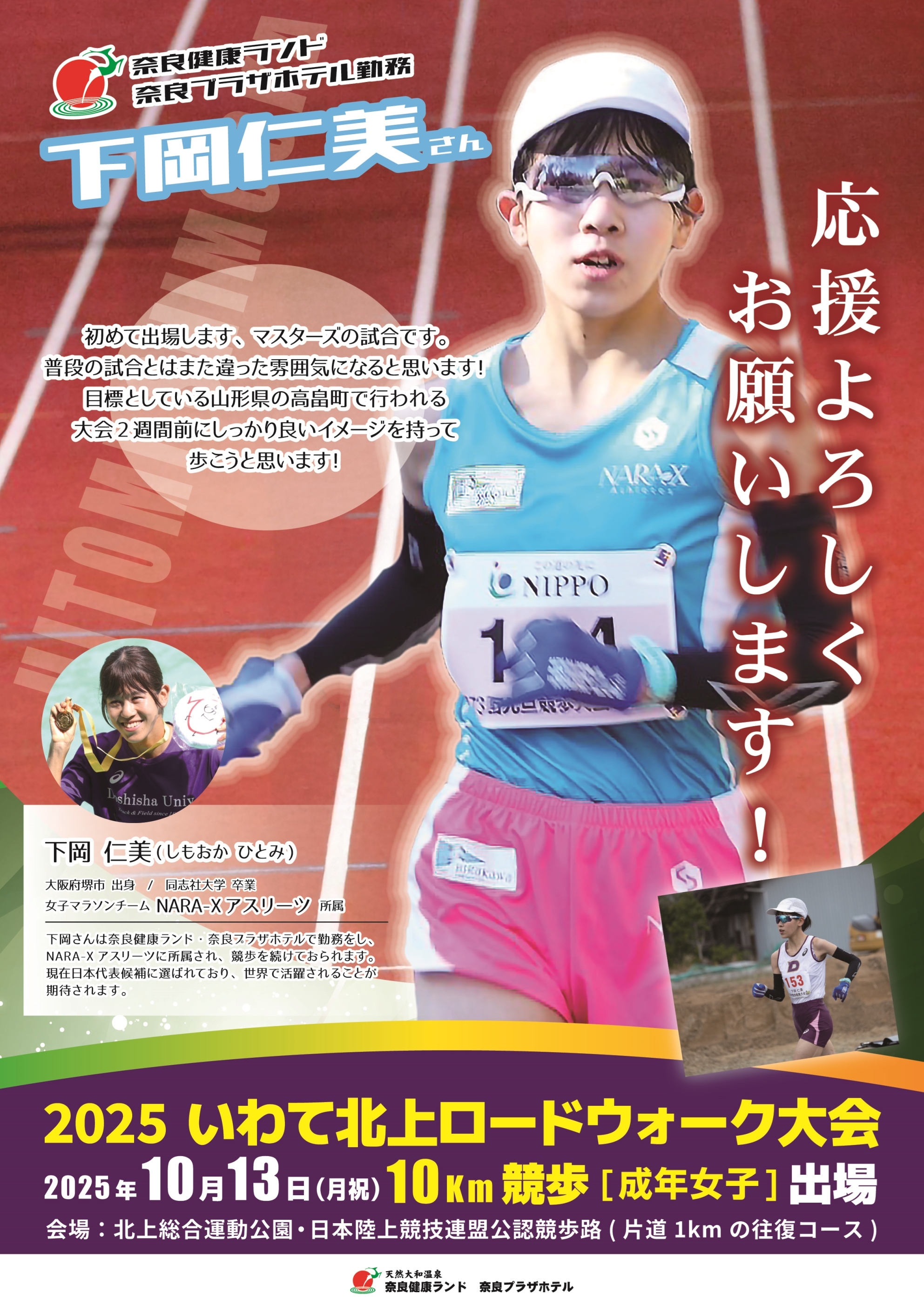NARA-Xアスリーツに所属され、奈良健康ランド奈良プラザホテルで勤務されている「下岡 仁美」さんが、10月13日(月・祝)開催の「2025 いわて北上ロードウォーク大会(10km競歩[成年女子])」に出場されます。