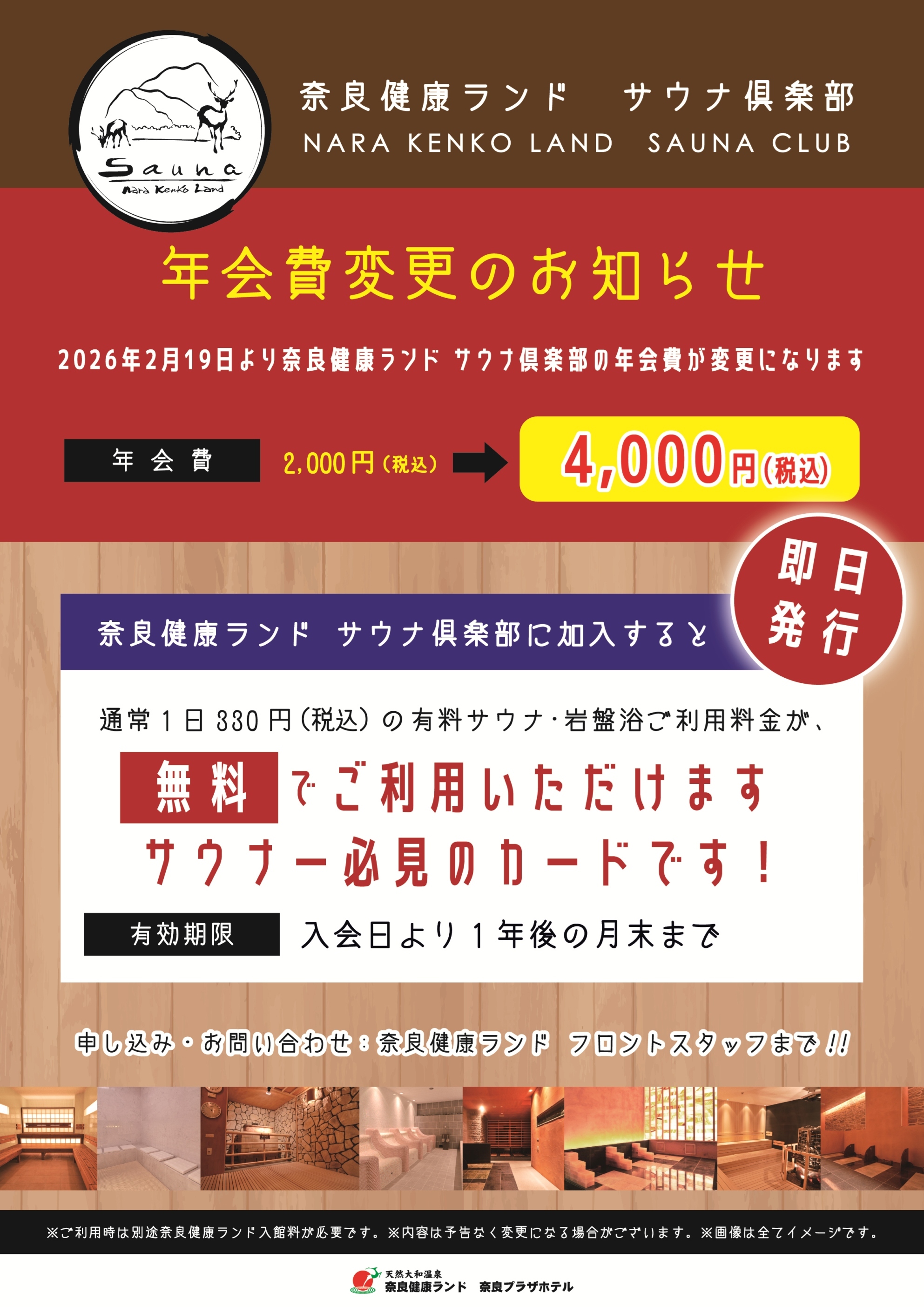 この度は、奈良健康ランドサウナ俱楽部年会費を2026年2月19日(木)より料金改定させていただくこととなりました。